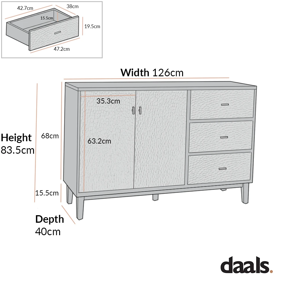 - The sideboard offers 2 door cupboard and 3 drawers for storage.