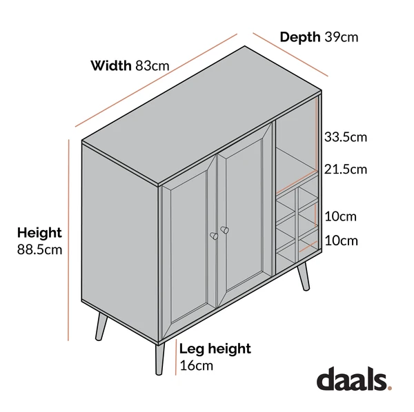 - The cabinet door opens to storage space, with more open shelves to showcase your favourite drinks and decorative items.