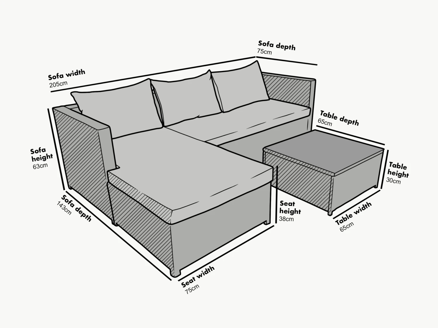 - Overall size: W 205 x D 143 x H 63 cm. 2-Seater sofa size: W 130 x D 75 x H 63 cm. Lounge seat size: W 75 x D 143 x H 63 cm. Coffee table: W 65 x D 65x H 30 cm.